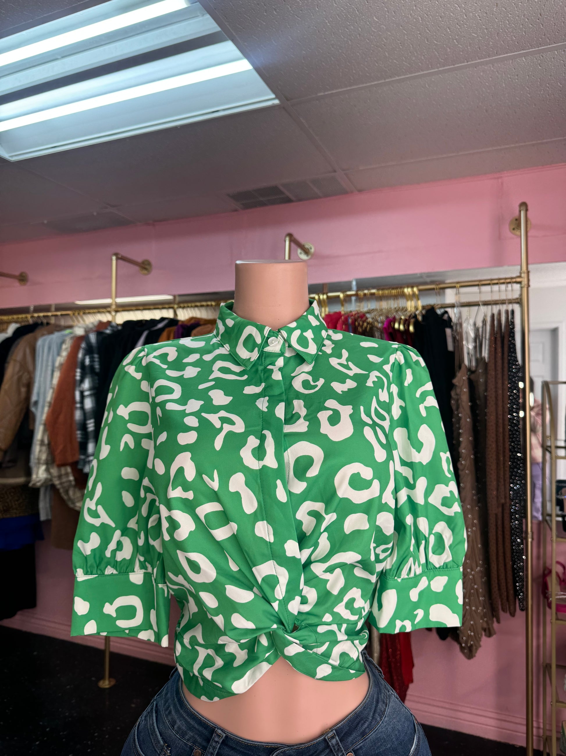Blusa color Verde con detalles de manchas Blancas