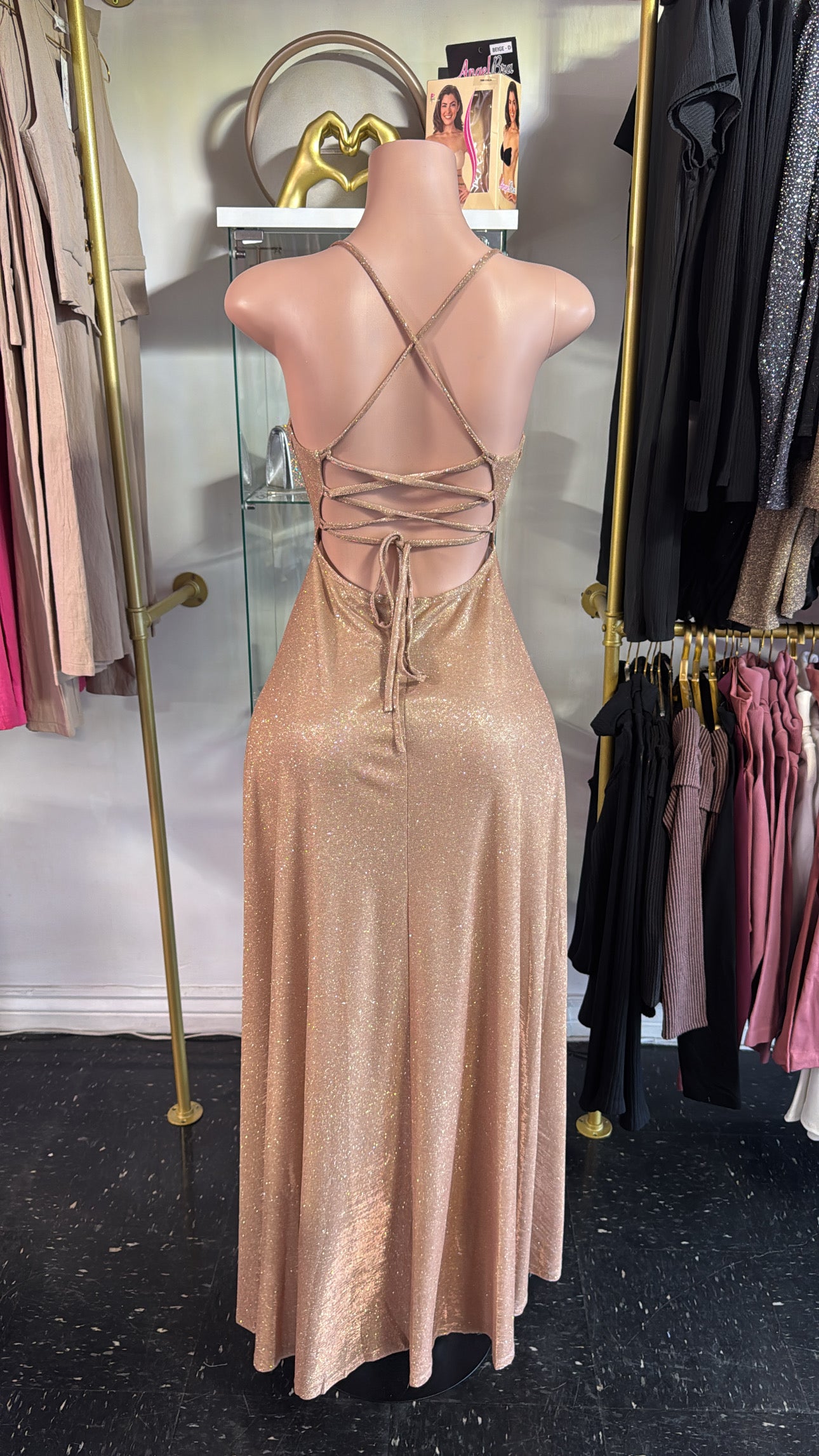 Vestido de Noche, Color Rosa gold brilloso, Cruzado de atrás