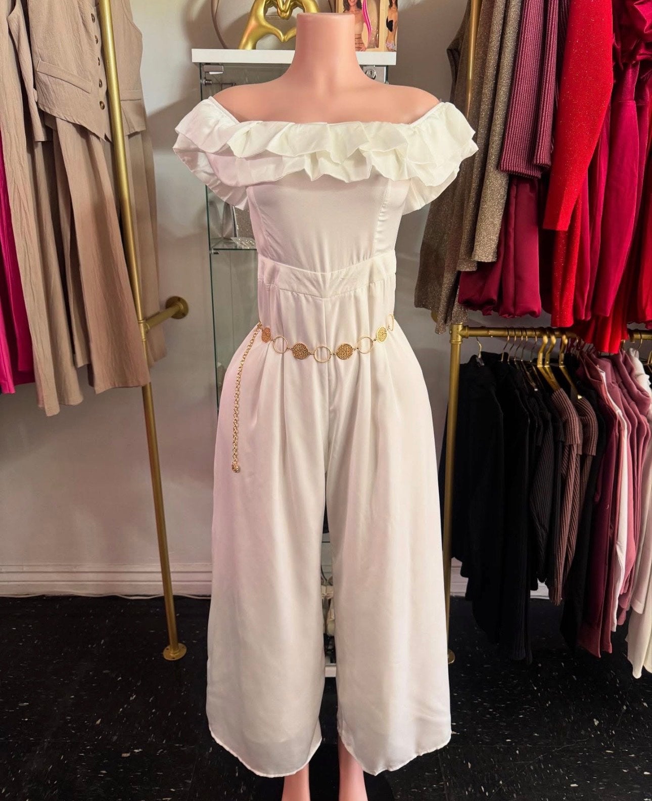 Palazo color Blanco con cinto color dorado alrededor de la cintura.