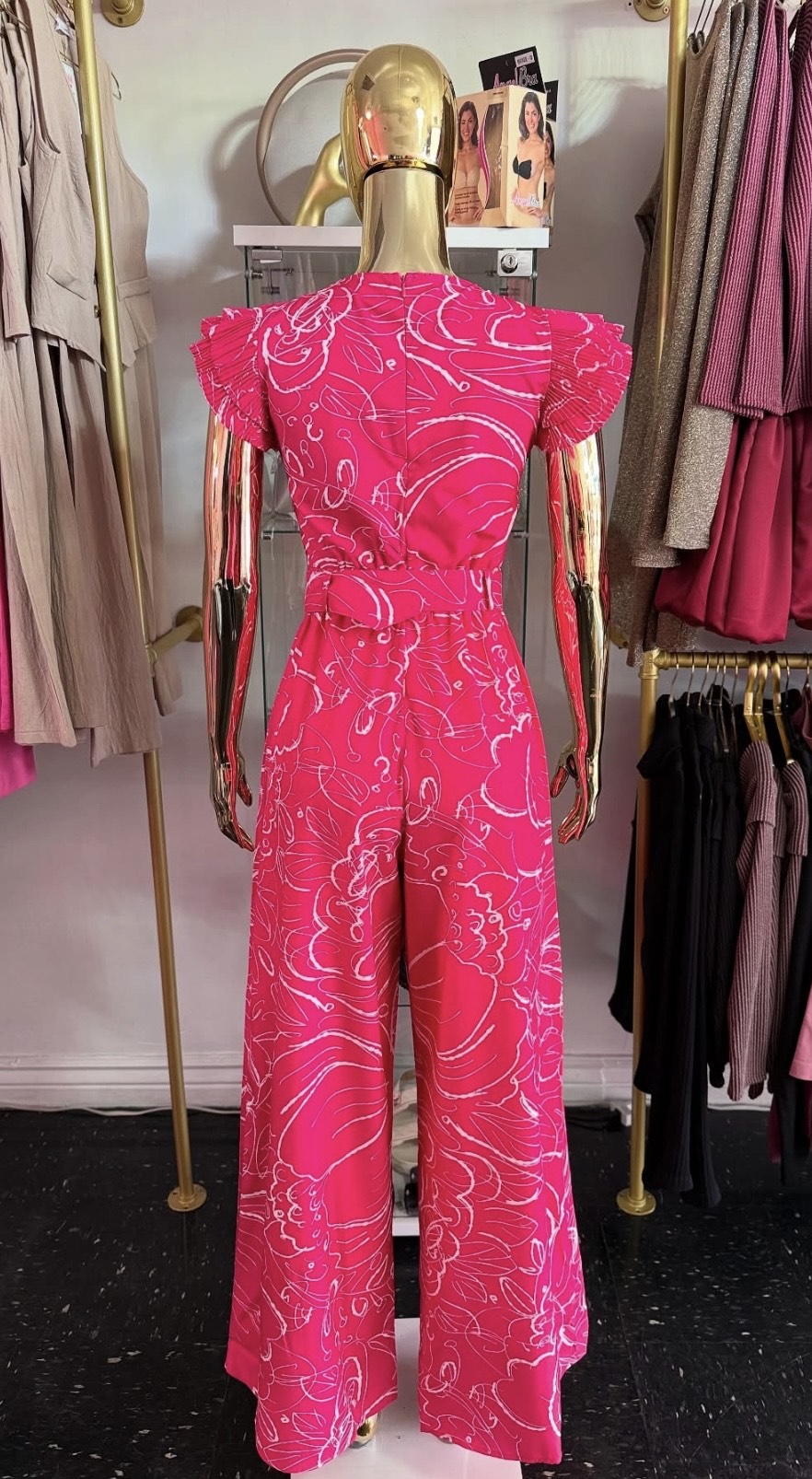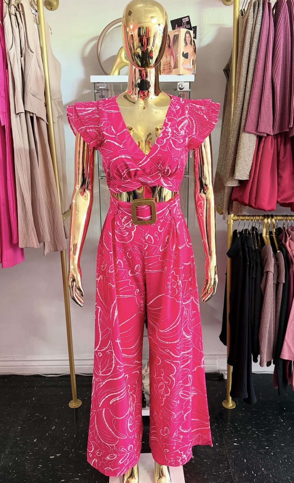 Palazo color Rosa Fiusha con detalles Blancos, contiene cinto alrededor de la cintura. No stretch.