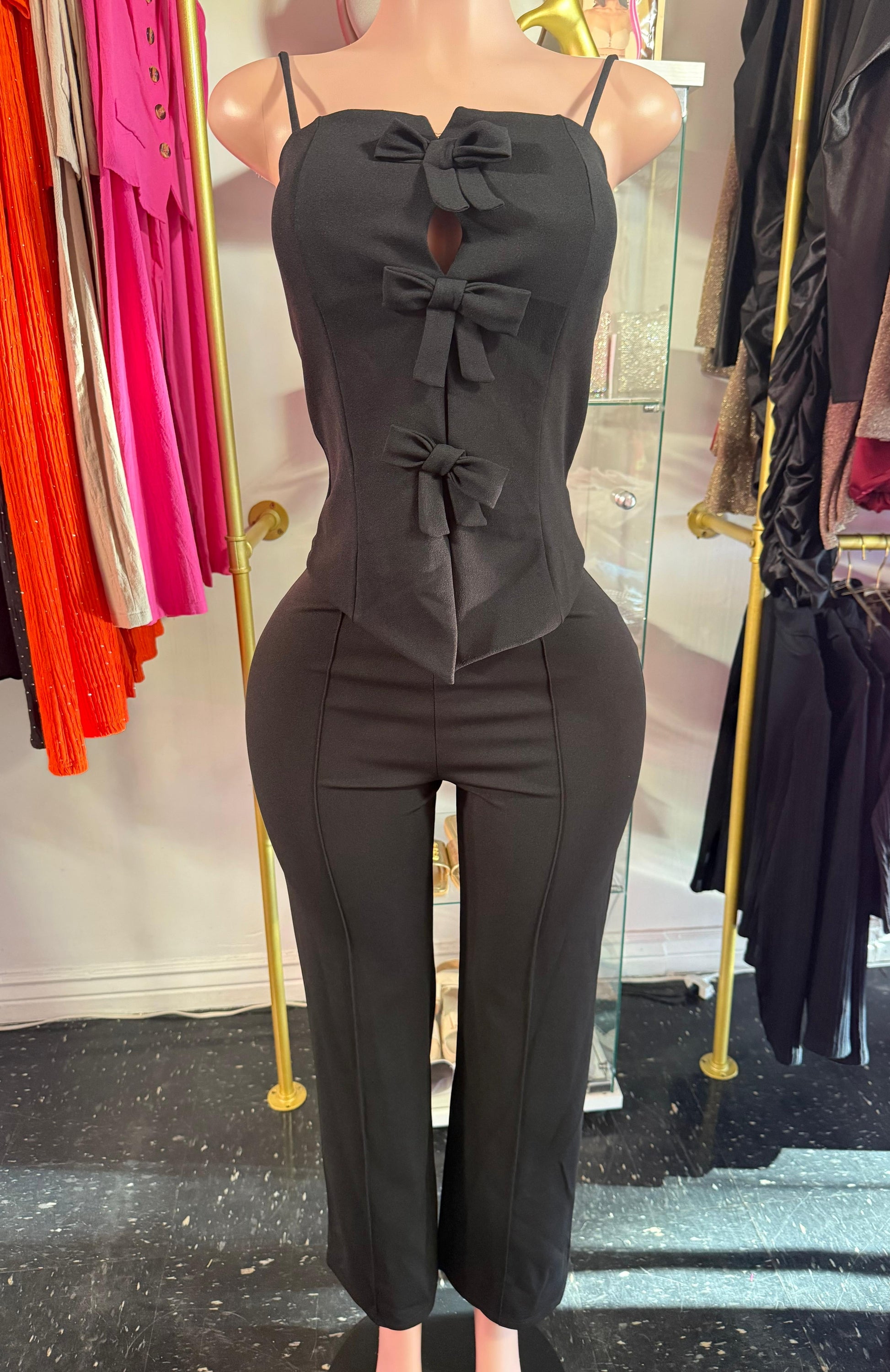 Set de vestir con blusa contiene monos enfrente con pantalon en color Rosa Fiusha y Negro