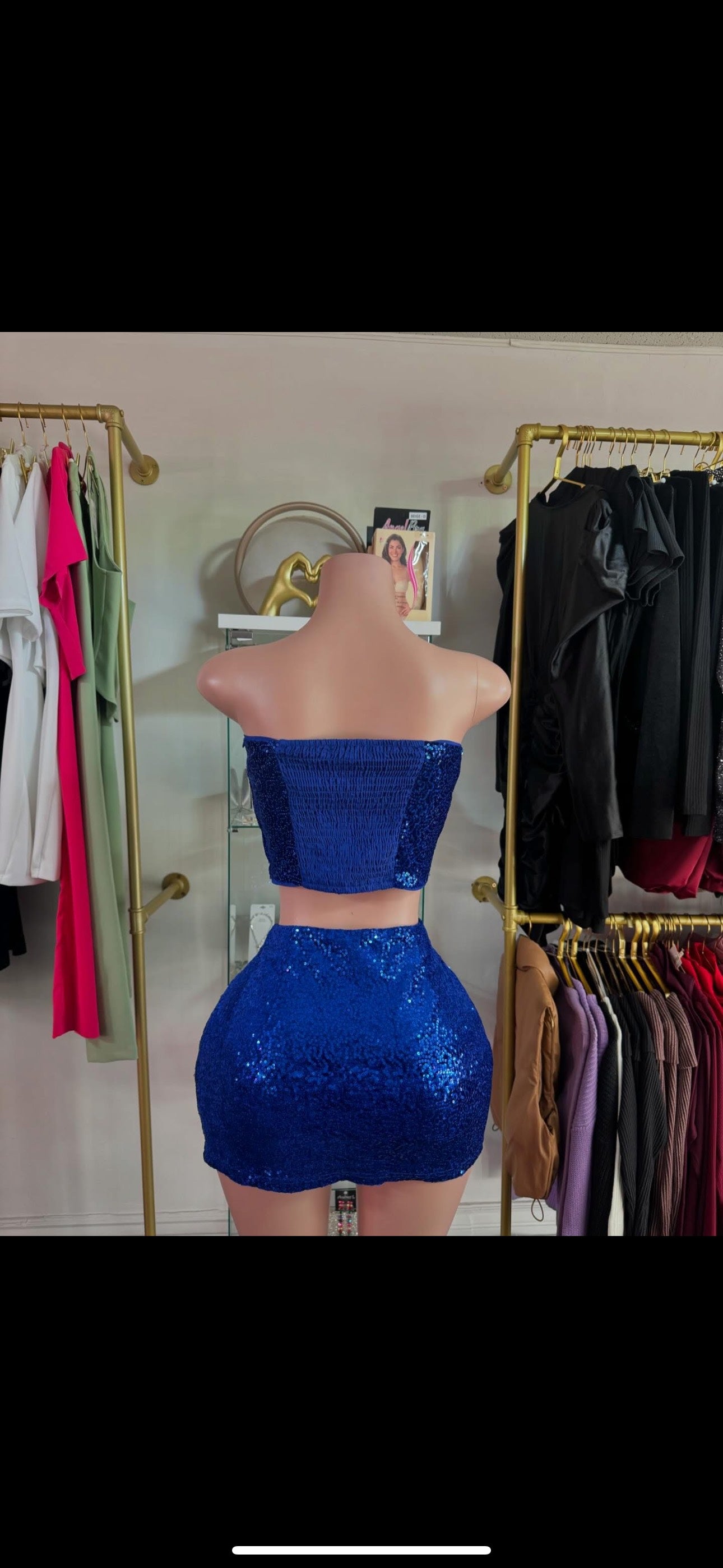 Set color Azul de lentejuelas, contiene short abajo de la falda